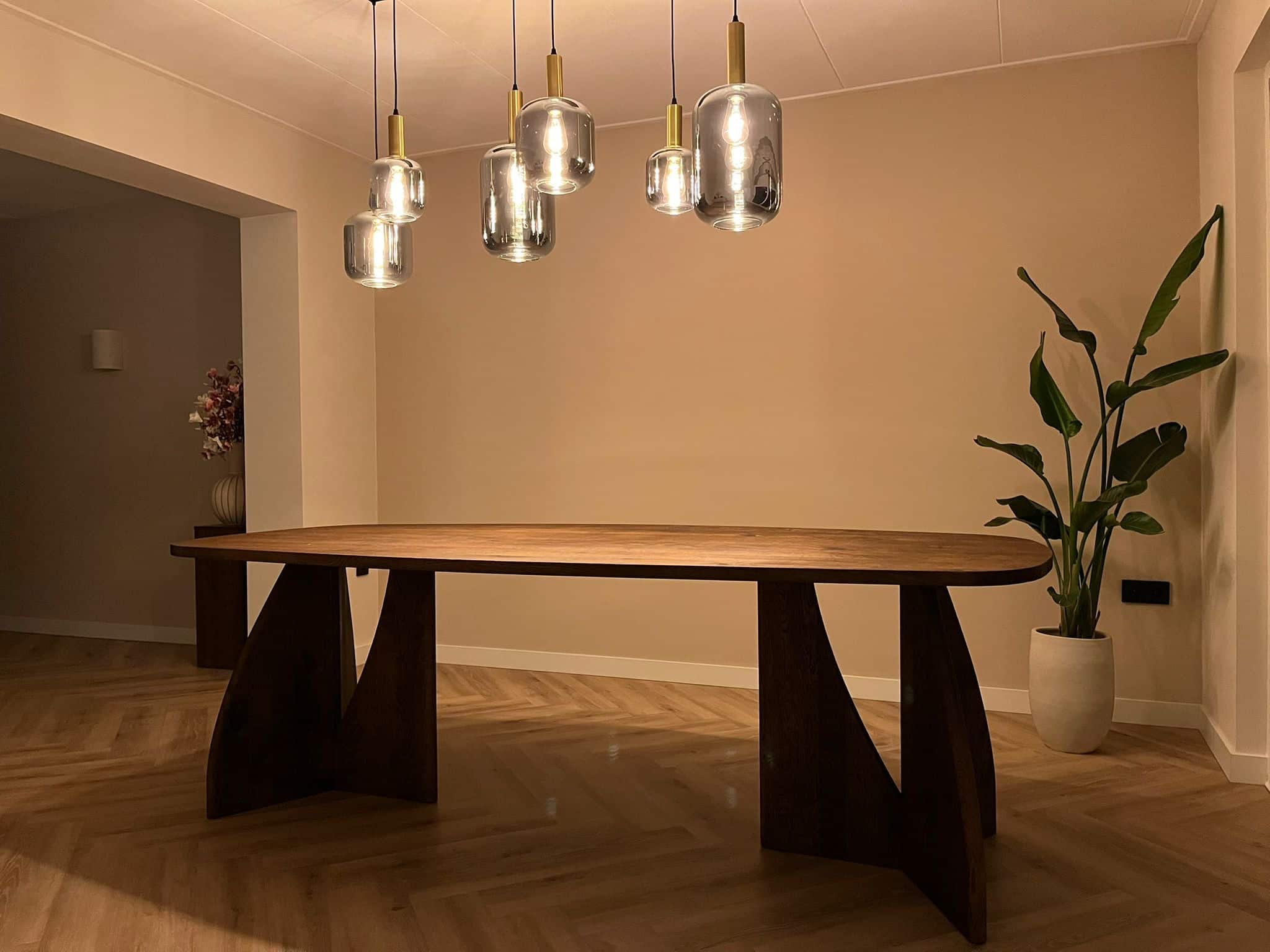 Bij de eikenhouten tafels kun je kiezen voor een verjongde rand. Een verjongde rand betekent dat de rand van het tafelblad 45 graden naar binnen is gezet. Dit geeft een effect van een zwevend tafelblad en ziet strak uit. Daarnaast kun je kiezen voor een bepaalde dikte van het tafelblad. De dikte staat aangegeven bij de tafel in centimeters.
